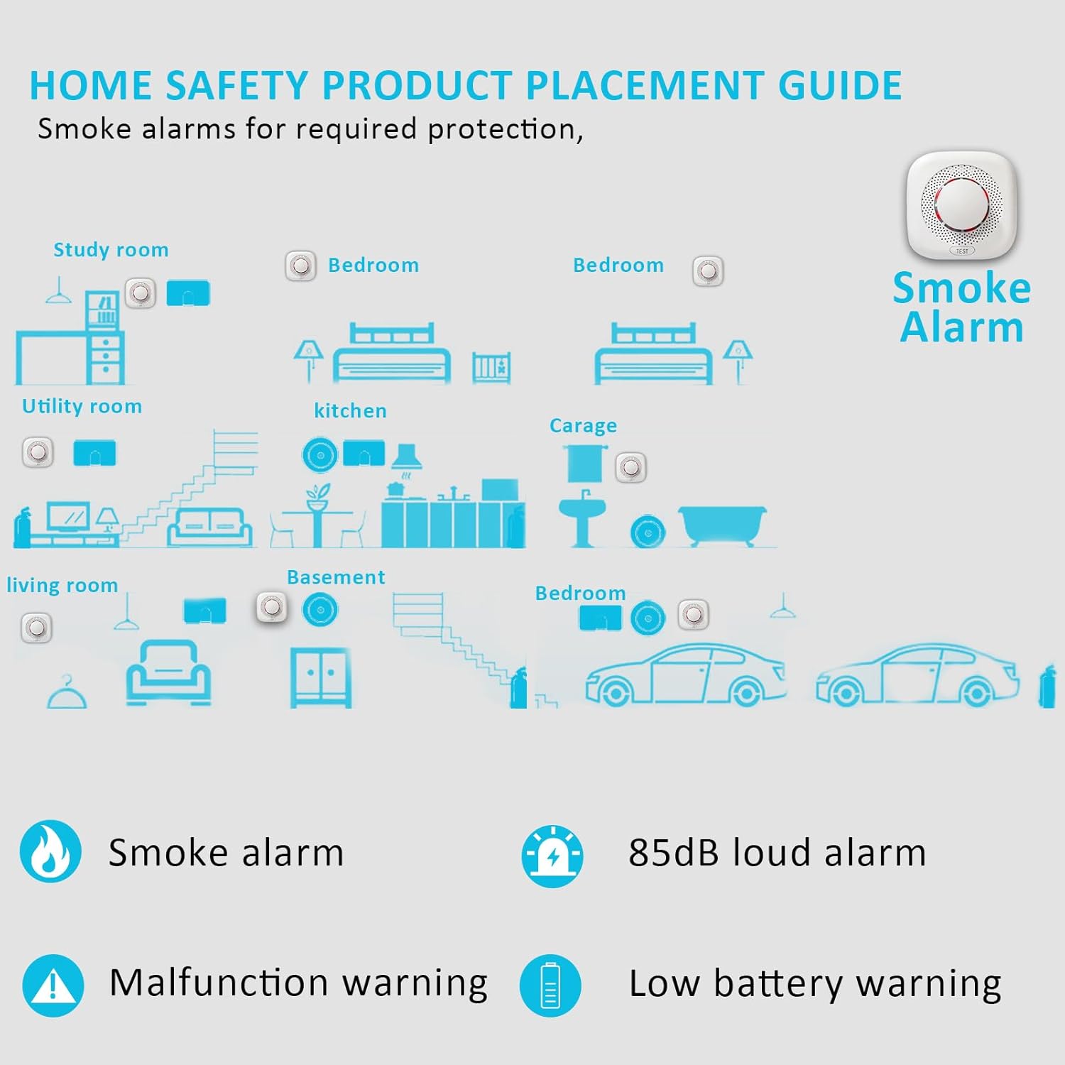 TEST & HUSH FUNCTION – Press the large test button to check if the alarm is functioning properly. If a false alarm occurs, press and hold the button for 5 seconds to silence it.